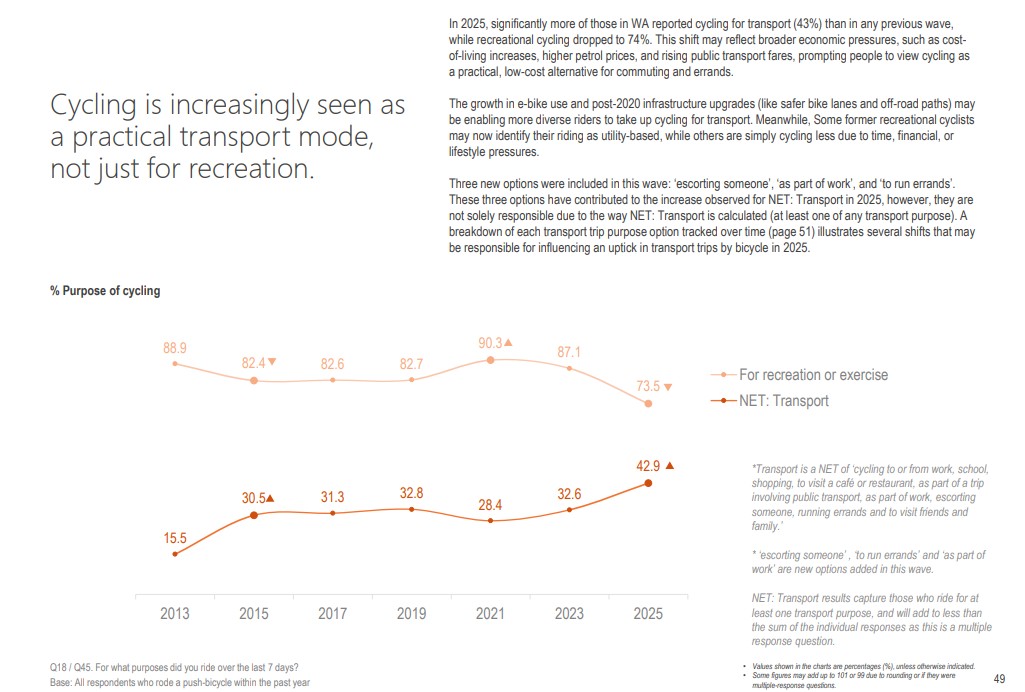 But the trend is clear with those riding for recreation and fitness dropping from about 90% in 2013 to 74% in 2025, while those riding for transport reasons has risen from 15.5% in 2013 to 43% today.