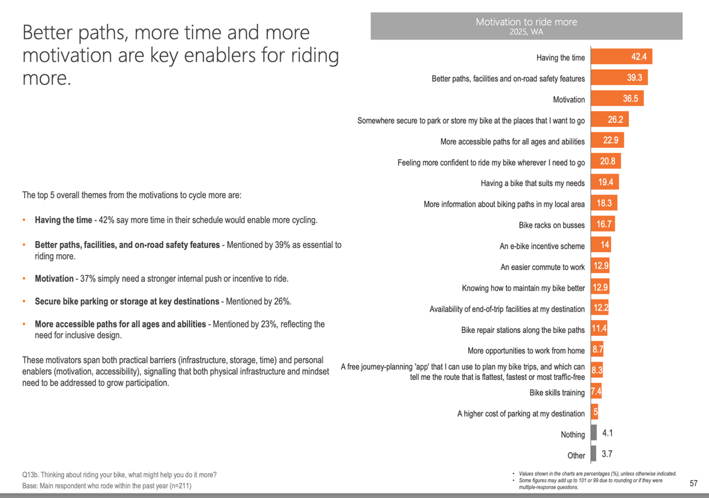 Drilling deeper into the motivations for people ride, the most common response was that people would ride more if they had more time (42%).