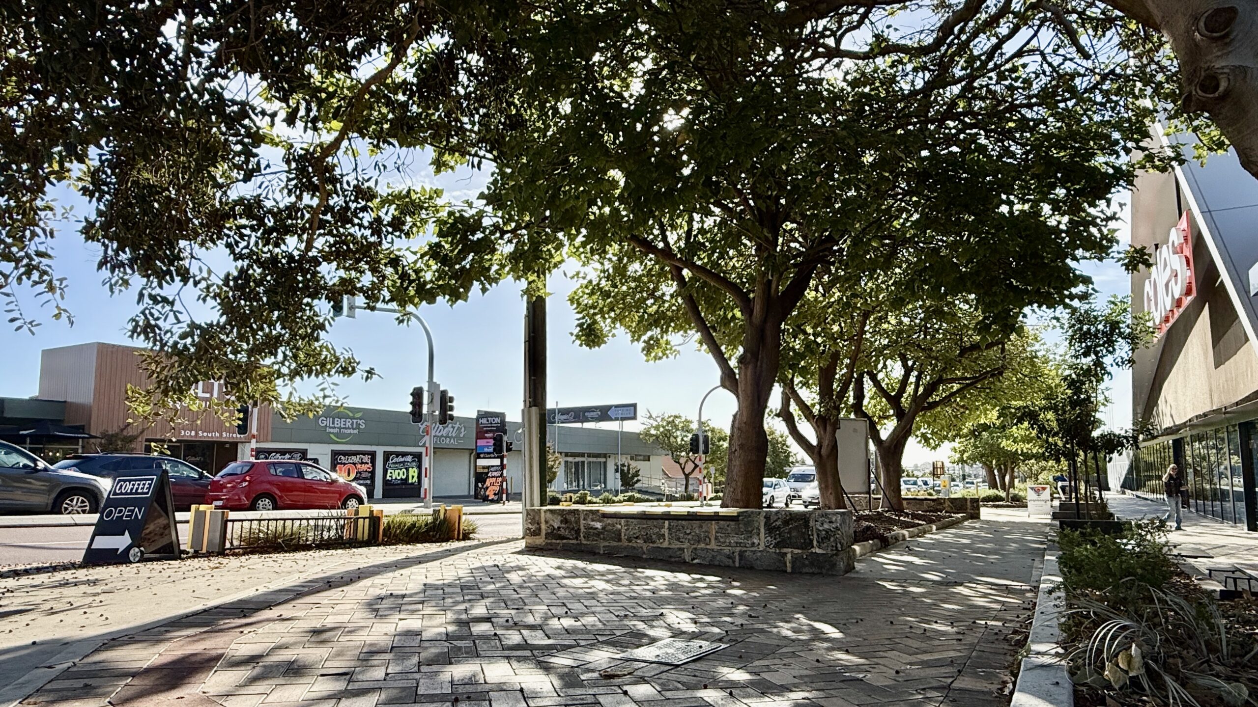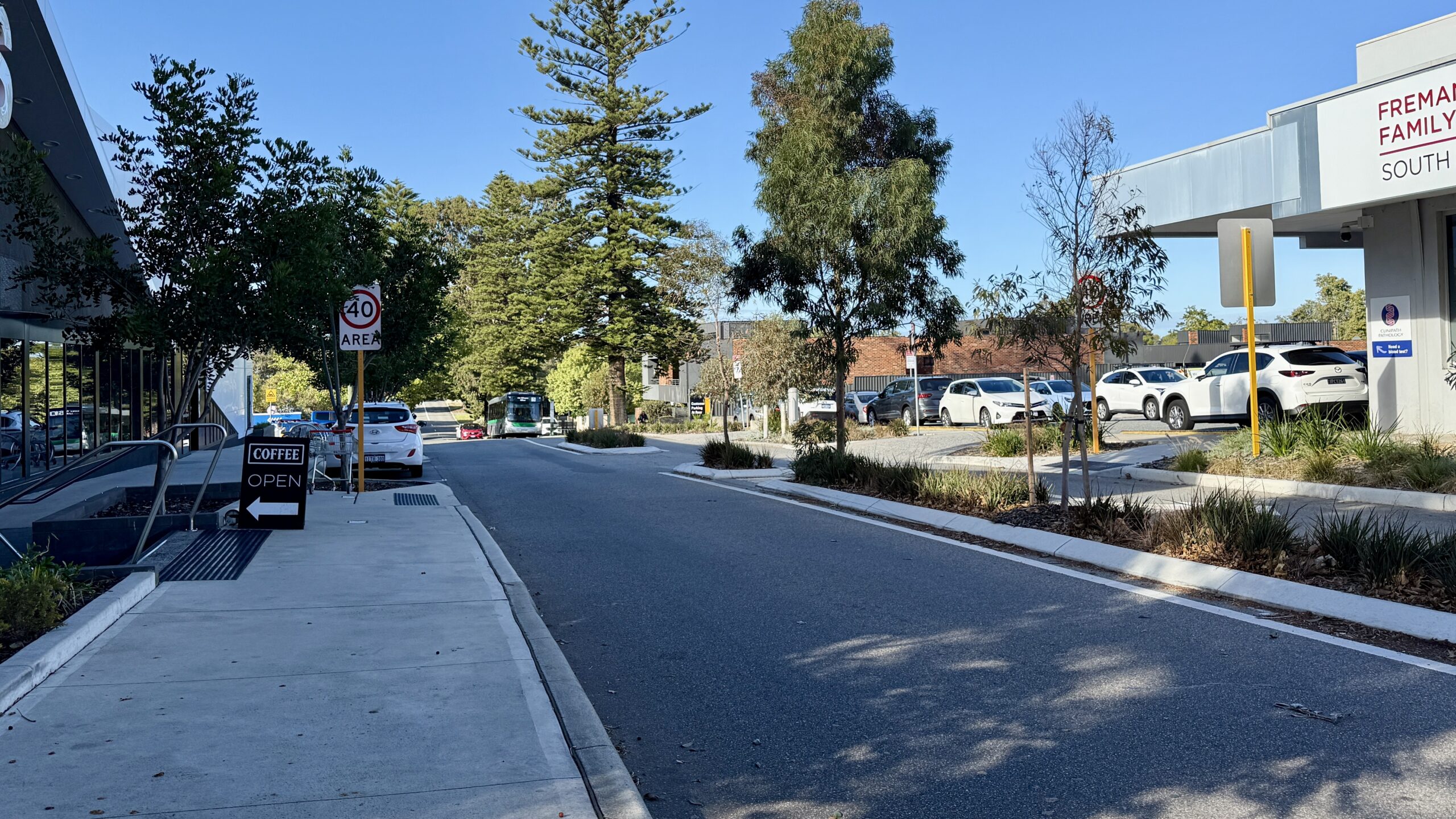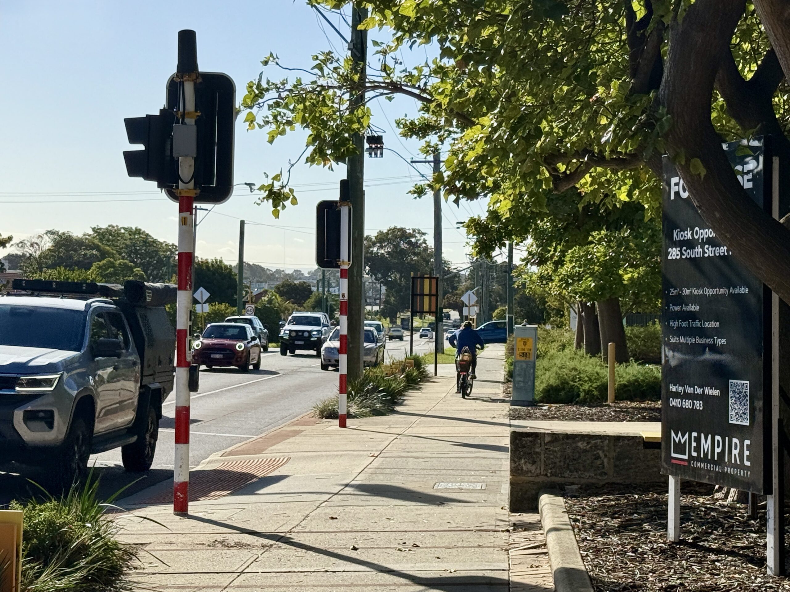 The signalised pedestrian crossing and 40km/h speed limit make it easier to access the other shops and bus stop. Adding more places to safely cross further down South Street, and expanding the 40km/h zone to include O’Connor, would help more locals use a bike for their daily trips.