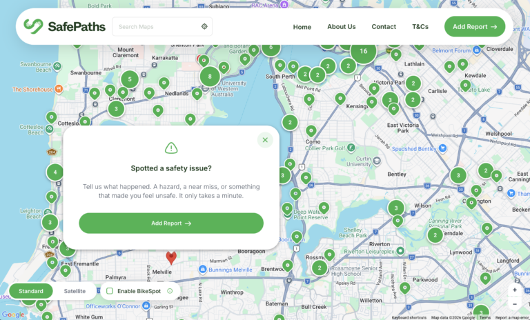 The SafePaths tool, part of a project led by a team from the Planning and Transport Research Centre (PATREC) at UWA, is a proof-of-concept for riders to report safety concerns and builds an evidence-base that can be used to inform path design and maintenance.
