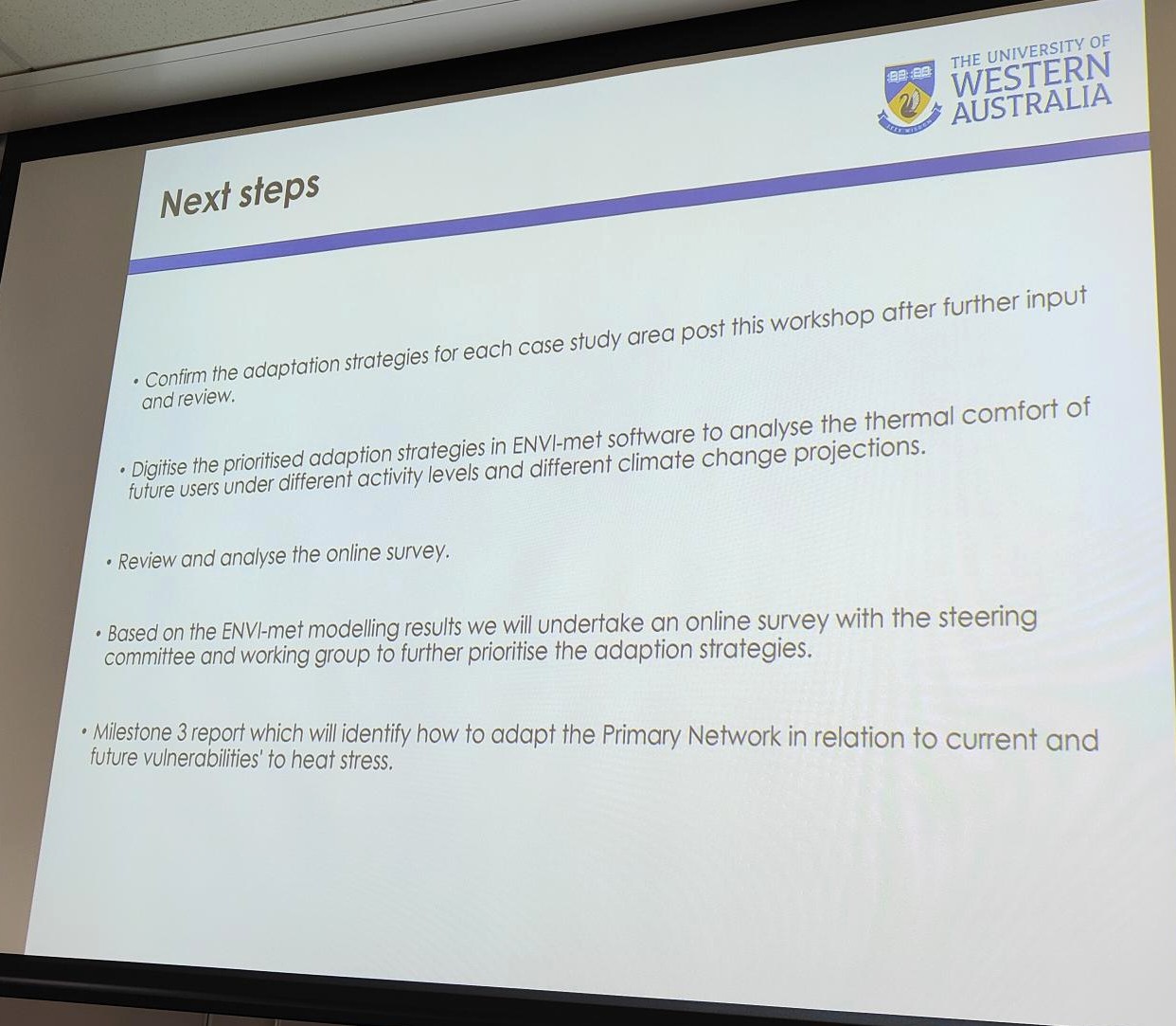 This month, as a steering committee member, WestCycle attended a workshop facilitated by the Australian Urban Design Research Centre (AUDRC) for their climate resilient paths project. For a few years now WestCycle has strongly advocated for amenities along the Principal Shared Path network, often after arriving at stakeholder meetings slightly sunburnt and dehydrated from the ride. Our suffering seems to be making an impact, and we have been happy to see state government departments funding research projects like this. Hopefully we don’t have to wait too many more summers before we see shade, drink fountains, and toilets appearing alongside the paths.