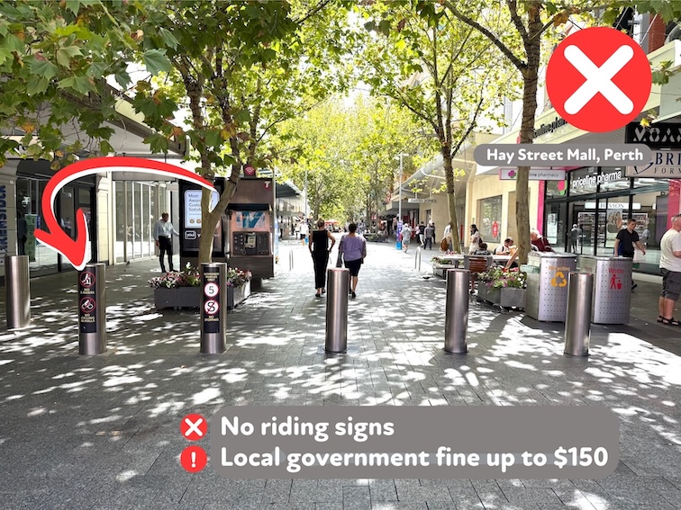 Usually you’ll see a shared path on the side where riding is permitted, but remember to always give way to pedestrians.