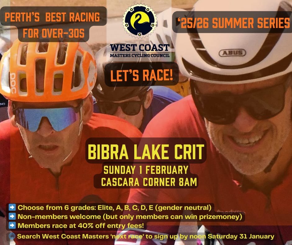 Enter online: https://www.wcmasterscycling.asn.au via the “Next Race” tab. (Riders can also enter on the day.)