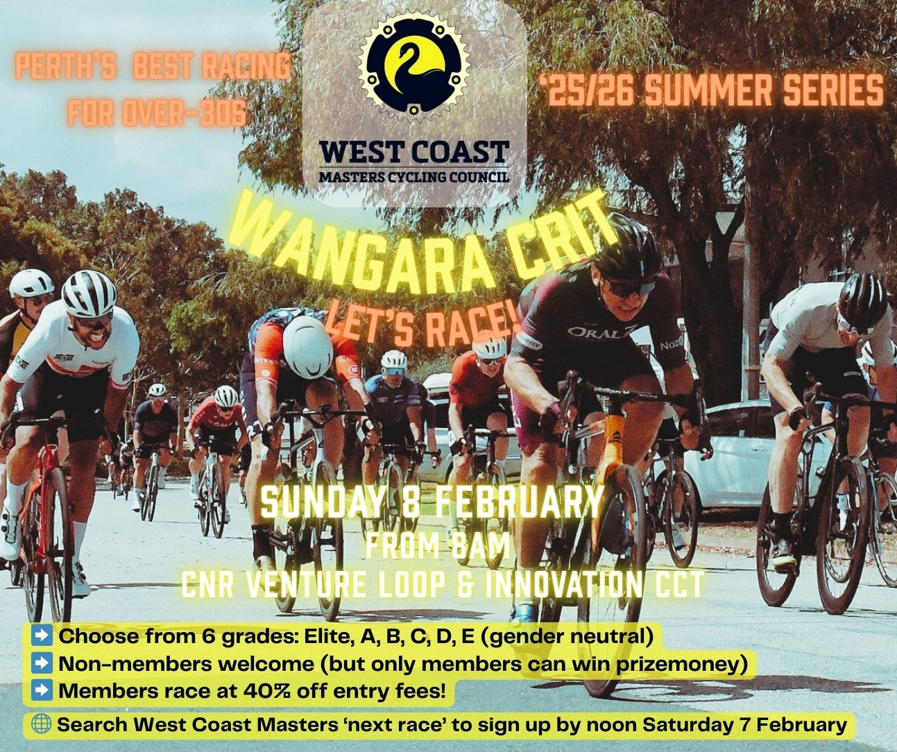 Enter online: https://www.wcmasterscycling.asn.au via the “Next Race” tab.